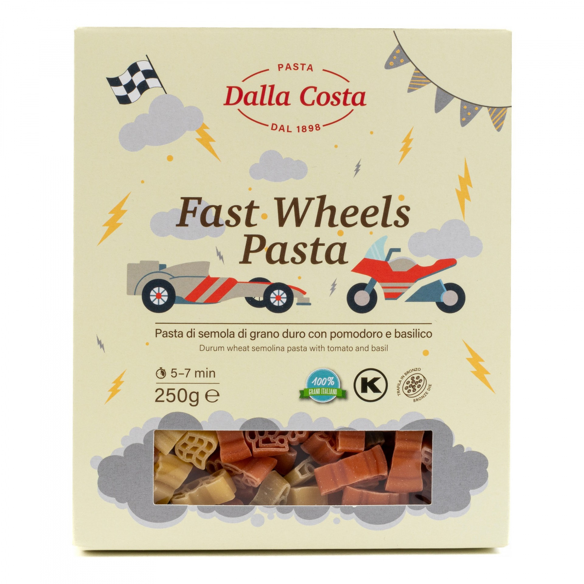 Макаронные изделия фигурные без добавления яиц с томатом и базиликом «Быстрые гонки» - разноцветные фигурные макароны из твердых сортов пшеницы в форме машинок,велосипедов идеальны для обеспечения здорового и полноценного сбалансированного питания. Подойдут для приготовления гарниров, запеканок, салатов и супов. Семья Далла Коста бережно хранит традиции производства итальянской пасты, эдакий любовный союз, который призван удовлетворять вкусам ценителей в разных уголках света. Для того чтобы расширить ассортимент и донести ценность превосходного продукта до потребителя, "Dalla Costa" запустила линии трехцветной и ароматизированной пасты, в секторе производства которых компания является лидером на сегодняшний день. Постоянное стремление к более высокому качеству находит отражение в новых вкусах, богатом ассортименте, разнообразии форматов и создании новых продуктов.
