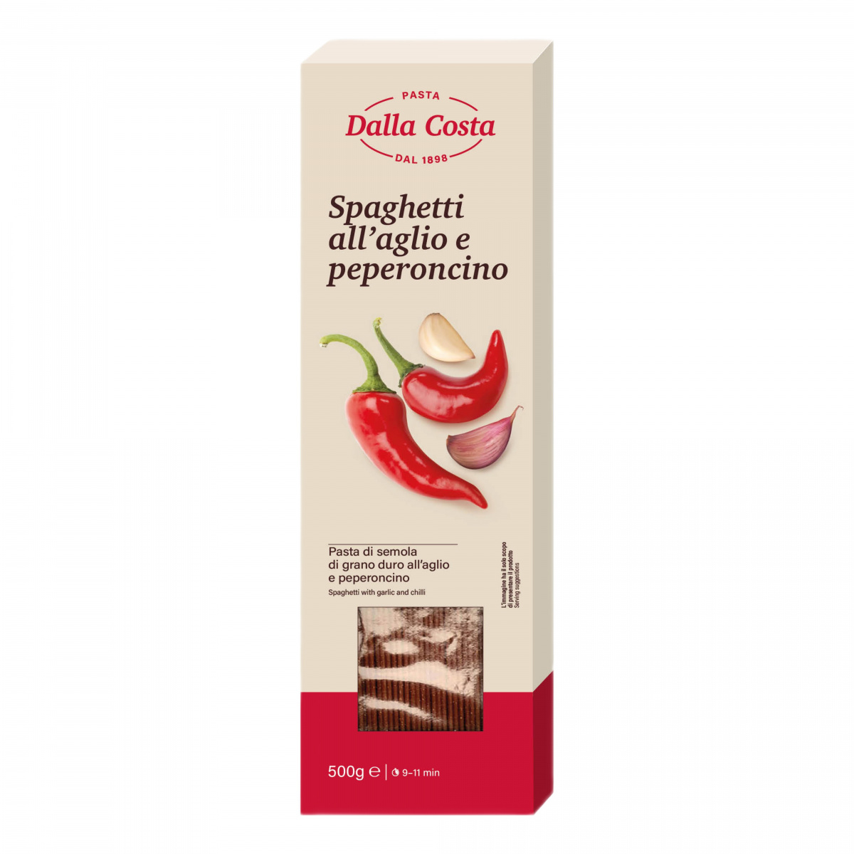Спагетти с чесноком, острым перцем и оливковым маслом – классика итальянской кухни! Спагетти с чесноком и острым перцем “Dalla Costa” приготовлены по семейному рецепту. В основе рецептуры мука из твердых сортов пшеницы, оливковое масло, несколько зубчиков чеснока и щепотка хлопьев острого перца. Пикантные спагетти из твердых сортов пшеницы, великолепны с оригинальными соусами в сочетании с оливками, с артишоками и каперсами.Семья Далла Коста бережно хранит традиции производства итальянской пасты, эдакий любовный союз, который призван удовлетворять вкусам ценителей в разных уголках света. Для того чтобы расширить ассортимент и донести ценность превосходного продукта до потребителя, "Dalla Costa" запустила линии трехцветной и ароматизированной пасты, в секторе производства которых компания является лидером на сегодняшний день. Постоянное стремление к более высокому качеству находит отражение в новых вкусах, богатом ассортименте, разнообразии форматов и создании новых продуктов.