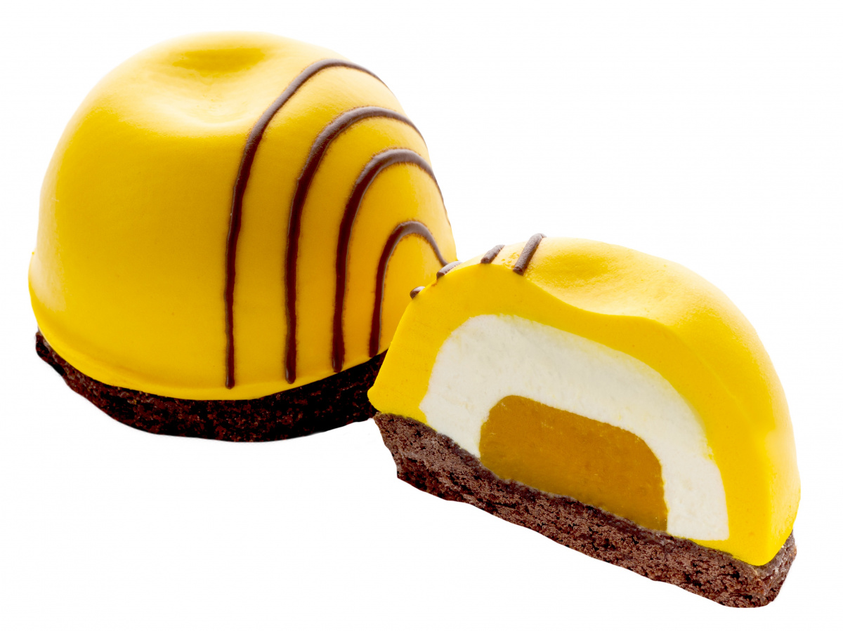 Пирожное Манго-маракуйя "Kristov" - на хрустящей песочной основе сочное пюре манго, слой ванильного мусса и ароматный мусс из манго и маракуйи.