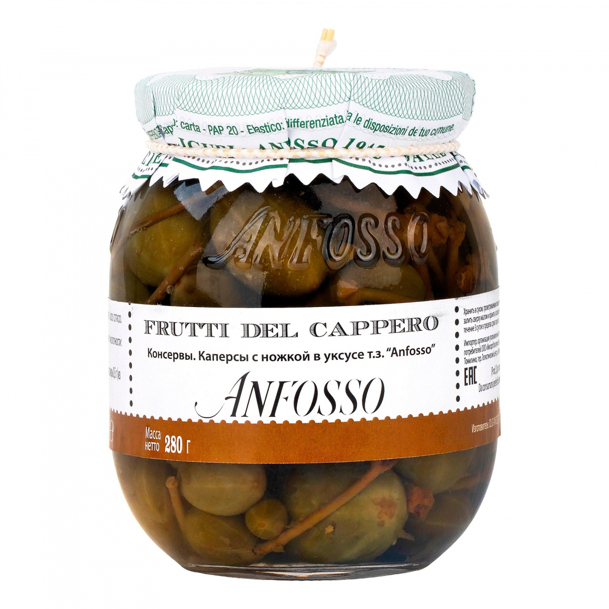 Плоды каперсов в уксусе Anfosso являются типичным продуктом стран Средиземноморья и отличаются от привычных каперсов без ножки более вытянутой формой, хрустящей консистенцией и соленым вкусом. Кроме того, существенная разница между каперсами с ножкой и привычными каперсами заключается в том, что последние являются цветочной почкой растения, а первые настоящие плоды каперсов.