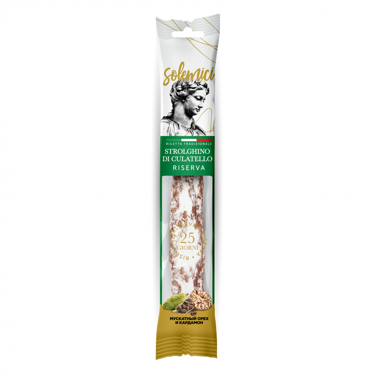 Свиная романская колбаска из нежирной части окороков. Очаровывает легким ароматом мускатного ореха, кардамона, приятной полутвердой консистенцией. Созревает не менее 25 суток. Подается толсто нарезанными кусочками. По желанию можно оставить оболочку с белой плесенью, она придаст колбаске дополнительный легкий грибной аромат со сливочным оттенком! Тост из свежего хлеба с ломтиками Строльгино ди Кулателло придаст вашему утру особый вкус, а вечером станет прекрасной закуской к аперитиву или бокалу Ламбруско. Каждое мясное изделие SOLEMICI — безусловный шедевр, вызывающий восхищение… Восхищение вкусом!