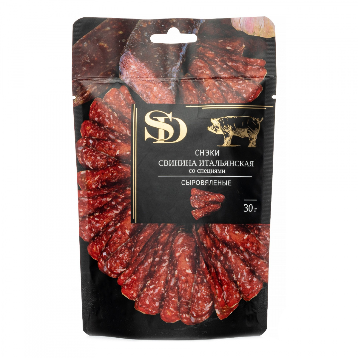 Снэки сыровяленые из свинины кИтальянские со специями приготовлены из отборного свиного мяса особого сорта. Этот удивительный мясной деликатес созревает на открытом воздухе не меньше четырех месяцев, а для его посола берут морскую соль, паприку, черный перец, чеснок и пажитник, а также острый перец чили. Кусочки нежного мяса, тающего во рту, обладают острым, пряным вкусом и аппетитным ароматом.