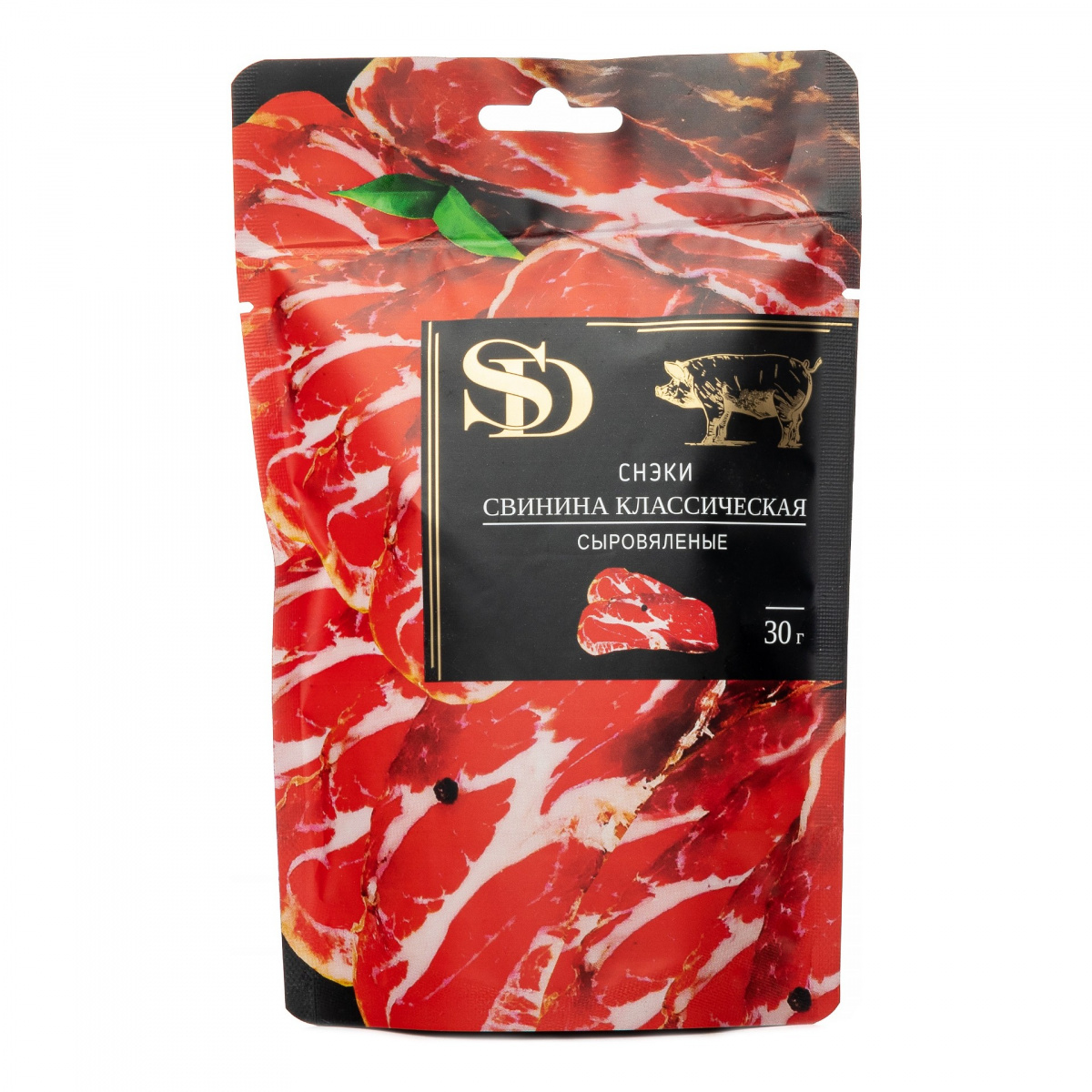 Быстро перекусить в середине дня, сервировать закуску к пиву или красному вину поможет снэки классические. Кусочки сыровяленого мяса приготовлены без искусственных ингредиентов — в составе отборная свинина, посолочная смесь, черный перец, чеснок и пажитник. После процесса засолки и созревания мясо приобретает яркий алый цвет, красивый мраморный рисунок на срезе и аппетитный аромат.