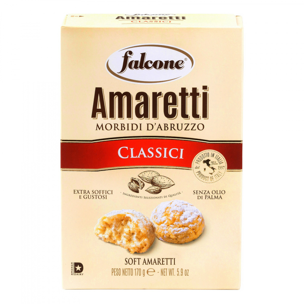 Миндальное печенье Амаретти - это классика итальянской выпечки. Нежная и мягкая начинка и хрустящая корочка свежеиспеченного печенья точно не оставят равнодушных. Амаретти впервые приготовили в 1718 году в городке Саронно в честь приезда кардинала Милана. Позднее пекарню, где делали горьковатое печенье, выкупил миланский кондитер Карло Лаццарони и наладил производство Амаретти в промышленных масштабах. Популярное итальянское печенье, слава о котором разошлась по всему миру. В классическом варианте это небольшое по размерам, сухое и хрустящее печенье, которое часто подается в итальянских кофейнях. Название произошло от слова "Аmaro", что означает горький. О производителе: Продукция "Falcone" высоко ценится в Италии и более чем в 50 странах мира. Премиальное качество и привлекательная упаковка была оценена по достоинству потребителями во многих странах мира. Печенье "Falcone" - 100% натуральное, без пальмового масла, гидрогенизированных жиров и консервантов. Итальянская семейная компания "La Dolciaria Falcone" основана в 1997 году братьями Фальконе: Франко, Карландреа и Родольфо. Бестселлерами являются знаменитые Cantucci d'Abruzzo («Кантучи д’Абруццо») и Soft Italian Amaretti (мягкое итальянское печенье «Амаретти») – это два типичных итальянских продукта, которые в настоящее время стали очень популярными и за рубежом.