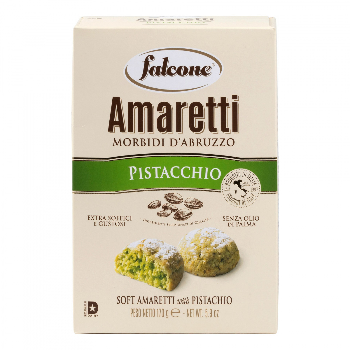 Фисташковое печенье Амаретти - это классика итальянской выпечки. Нежная и мягкая начинка и хрустящая корочка свежеиспеченного печенья точно не оставят равнодушных. Мягкое и невероятно ароматное итальянское печенье Амаретти приготовлено из миндальной и фисташковой муки с добавлением янтарного меда и орехов. Отличается изысканным вкусом с терпкими нотками. Итальянцы предпочитают лакомиться воздушными амаретти в качестве десерта после обеда или ужина за чашкой чая или кофе, а также подавать к рому и ликерам. О производителе: Продукция "Falcone" высоко ценится в Италии и более чем в 50 странах мира. Премиальное качество и привлекательная упаковка была оценена по достоинству потребителями во многих странах мира. Печенье "Falcone" - 100% натуральное, без пальмового масла, гидрогенизированных жиров и консервантов. Итальянская семейная компания "La Dolciaria Falcone" основана в 1997 году братьями Фальконе: Франко, Карландреа и Родольфо. Бестселлерами являются знаменитые Cantucci d'Abruzzo («Кантучи д’Абруццо») и Soft Italian Amaretti (мягкое итальянское печенье «Амаретти») – это два типичных итальянских продукта, которые в настоящее время стали очень популярными и за рубежом.