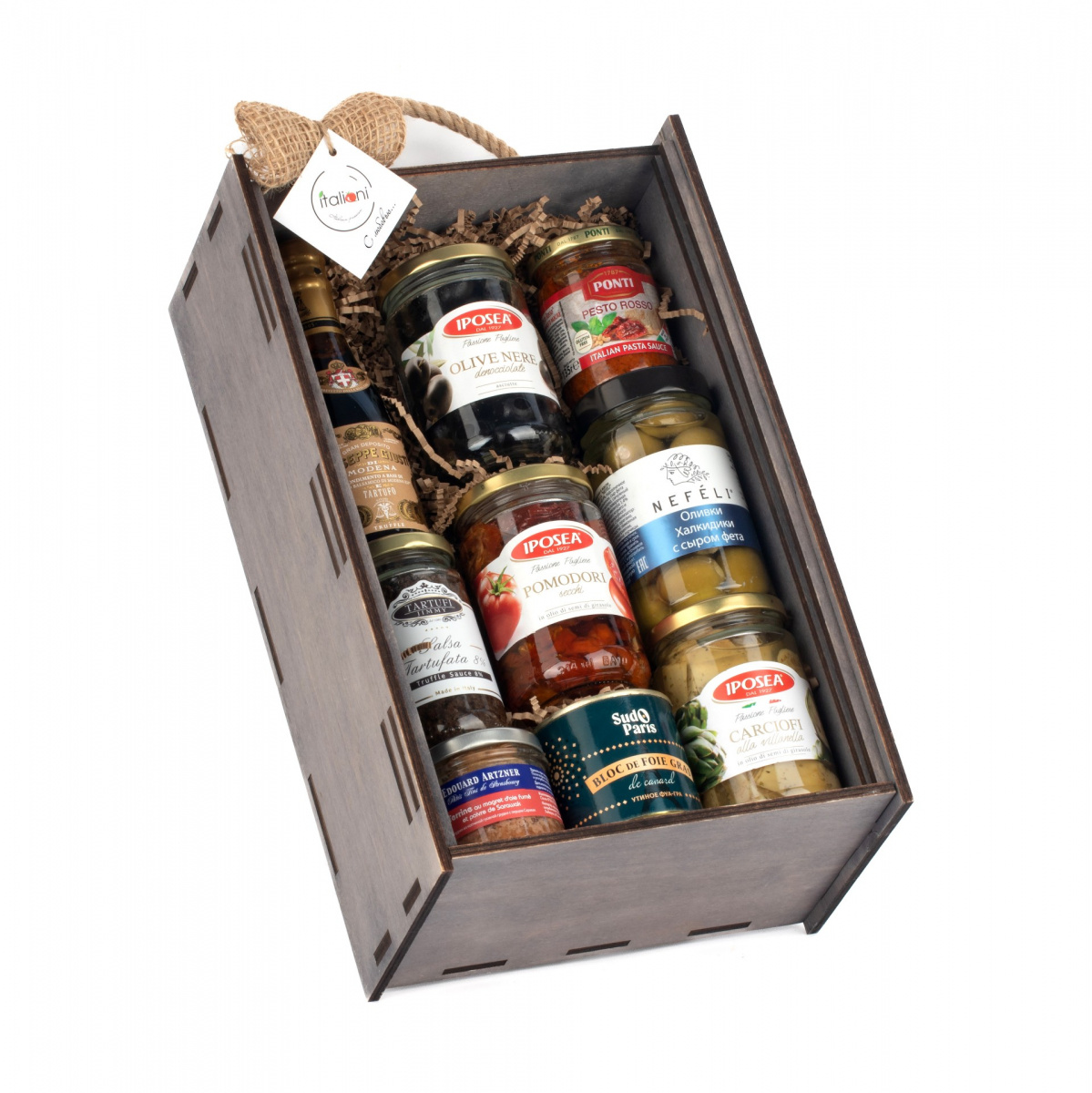 Соус трюфельный 8%, Tartufi Jimmy (0,180кг), Террин из копченой гусиной грудки с перцем Саравак, Edouard Artzner (0,100кг), Томаты сушеные в масле, IPOSEA (0,280кг), Маслины без косточки, без жидкости, IPOSEA (0,125кг), Оливки Халкидики с сыром Фета, NEFELI (0,290кг), Соус Песто Россо, Ponti (0,135кг)