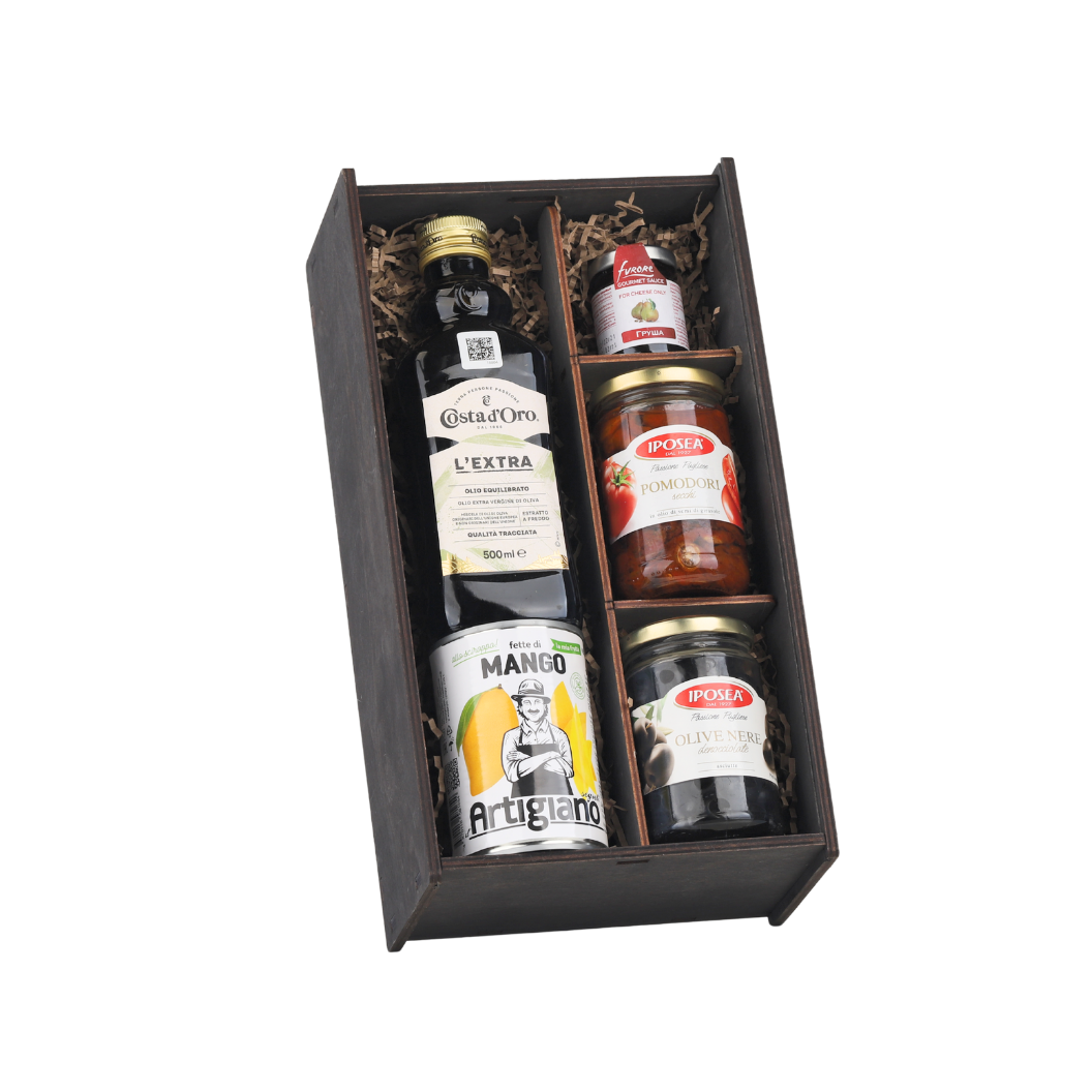 Масло оливковое Extra Virgin, Costa d’Oro (0,5л), Манго ломтики в сиропе ARTIGIANO (0,425кг), Томаты сушеные в масле, IPOSEA (0,280кг), Маслины без косточки, без жидкости, IPOSEA (0,125кг)