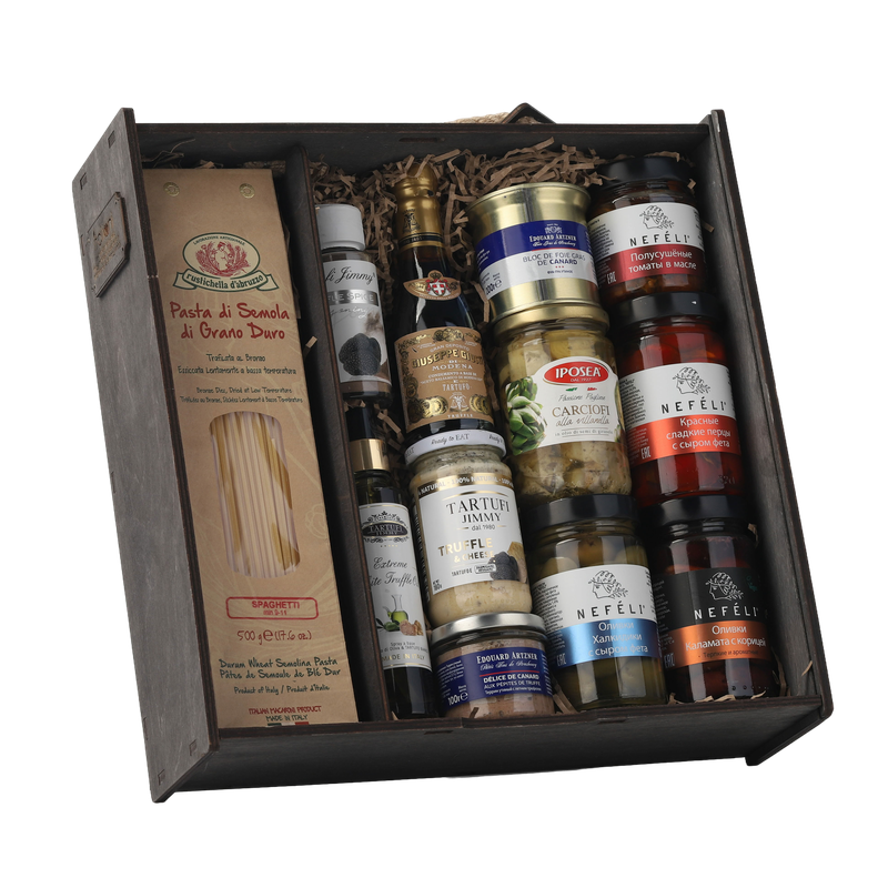 Паста без яиц Спагетти, Rustichella d'Abruzzo (0,500кг), Масло оливковое с белым трюфелем спрей, Tartufi Jimmy (0,100л), Трюфельная пудра, Tartufi Jimmy (0,065кг), Соус грибной трюфельный 3% c "Пармиджано Реджано", Tartufi Jimmy (0,180кг), Террин утиный с летним трюфелем, Edouard Artzner (0,100кг), Оливки Халкидики с сыром Фета, NEFELI (0,290кг), Артишоки Алла Рустика в масле, IPOSEA (0,290кг), Фуа-гра утиное блок Edouard Artzner (0,200кг), Полусушеные томаты в подсолнечном масле, NEFELI (0,190кг), Перцы красные сладкие с сыром Фета, NEFELI (0,290кг), Оливки Каламата с корицей без косточки, NEFELI (0,310кг)