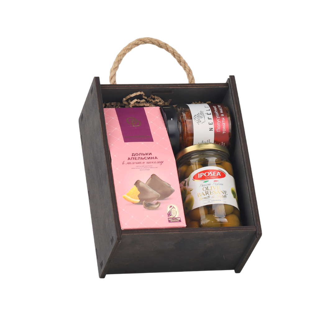 Стильный и вкусный подарок для тех, кто ценит гармонию натуральных вкусов. В наборе собраны оливки и томаты в лучших средиземноморских традициях, дополненные изысканным десертом — дольками апельсина в шоколаде. Всё оформлено в деревянный подарочный пенал с крафтовым наполнителем и лентой — готовое решение для презента коллегам, друзьям или близким.