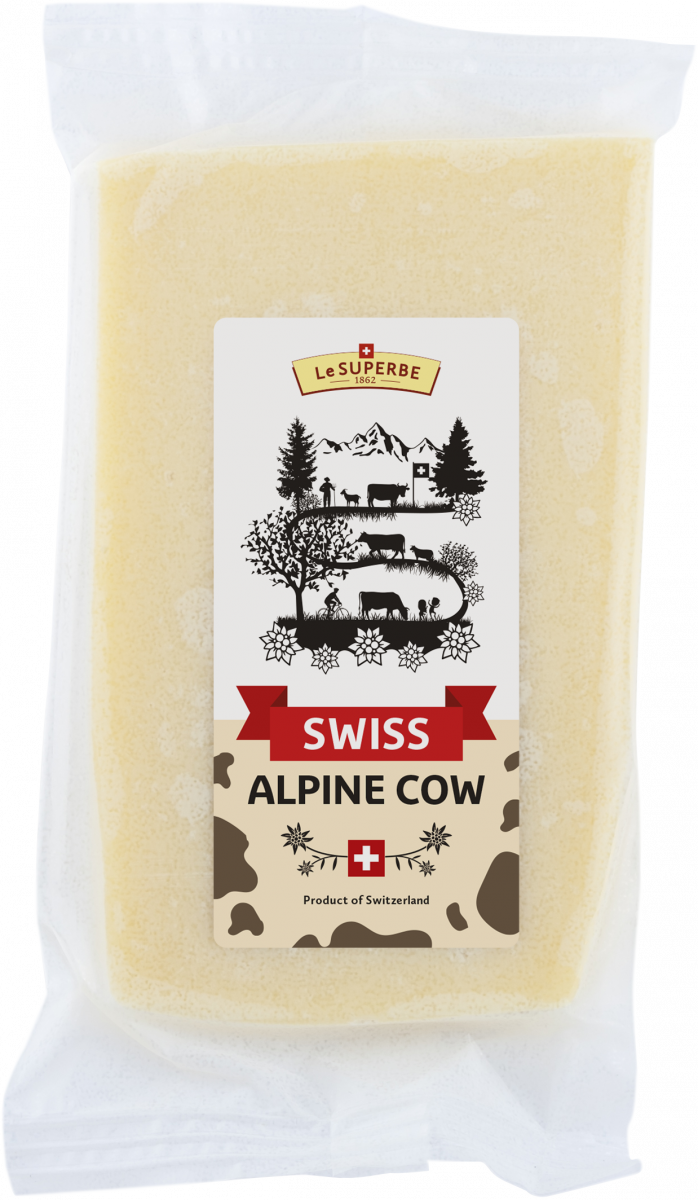 Пасущиеся коровы на альпийских лугах, полных цветов и свежей травы, невероятные горные пейзажи и чистый воздух, - вот место происхождения нашего сыра LeSuperbe Swiss Alpine Cow. Знаете ли вы, что в Швейцарии у каждой коровы есть имя? И каждый швейцарский фермер знает как зовут всех его коров. Эти благонравные животные – неотъемлемая часть швейцарского пейзажа, их можно увидеть повсюду в стране. Из лучшего швейцарского молока от этих коров и производится наш сыр LeSuperbe Swiss Alpine Cow. Для производства этого сыра используются современные мощности, но традиционные процессы.Сыр производится ремесленным способом недалеко от места дойки, и созревает под тщательным контролем наших мастеров сыроделов. В результате получается превосходный твердый сыр. Сыр LeSuperbe Swiss Alpine Cow обладает твердой и гладкой текстурой, но в тоже время мягким и чистым вкусом. Этот подлинный и высококачественный сыр полностью натуральный, без добавок и консервантов. Сыр LeSuperbe Swiss Alpine Cow напоминает о бескрайних зеленых лугах, на которых пасутся швейцарские коровы, и которые ярко освещает солнце. Вы уже слышите звон кольколичиков местных коров? Сыр LeSuperbe Swiss Alpine Cow -настоящая легенда из Швейцарии.