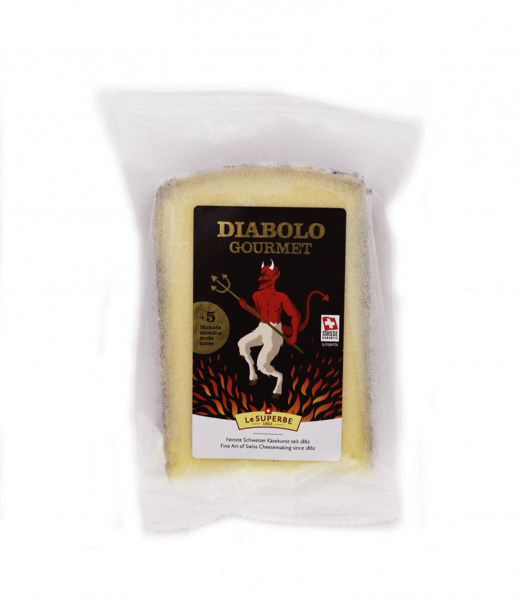 Сладкий как мед, сыр с дьявольским нравом – Diabolo Gourmet – носит много красок. Дьявольский соблазн – мягкая сердцевина, спрятанная в черной корочке. Древние легенды о демонах и призраках в дикой природе тесно переплетаются с традициями и обычаями местных жителей холмистой сельской местности на въезде в Тоггенбург. Этот яркий регион, где коровы до сих пор носят колокольчики, дает сыру Diabolo Gourmet его натуральность и нежный зрелый вкус. Своим качеством сыр обязан местным сыроварням, где сыр изготавливается вручную из свежего фермерского молока по старинным рецептам. После того как сыр в течение 5 месяцев обрабатывается секретным раствором, он приобретает свою нежную структуру и полностью раскрывает свой аромат дикого меда с нотами паприки и абрикоса. Перед этим дьявольским соблазном невозможно устоять.