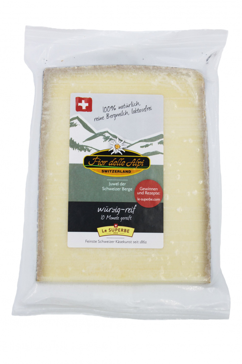 Горный воздух, луга с сочной травой, свежее молоко и традиционная рецептура – всё это привело к появлению сыра Fior delle Alpi - сокровища швейцарских гор, покрытого черной корочкой. Сыр Fior delle Alpi абсолютно уникален: в нем сочетается аромат деревенского молока и вкус мелких крупинок соли, тающих во рту. Горный туман окутывают сыроварню, где сыр «Fior delle Alpi» вручную изготавливается по старинным рецептам. Только при пристальном внимании сыроваров и тщательной выдержке в погребах на протяжении 12 месяцев достигается настоящий вкус уникального сыра «Fior delle Alpi».