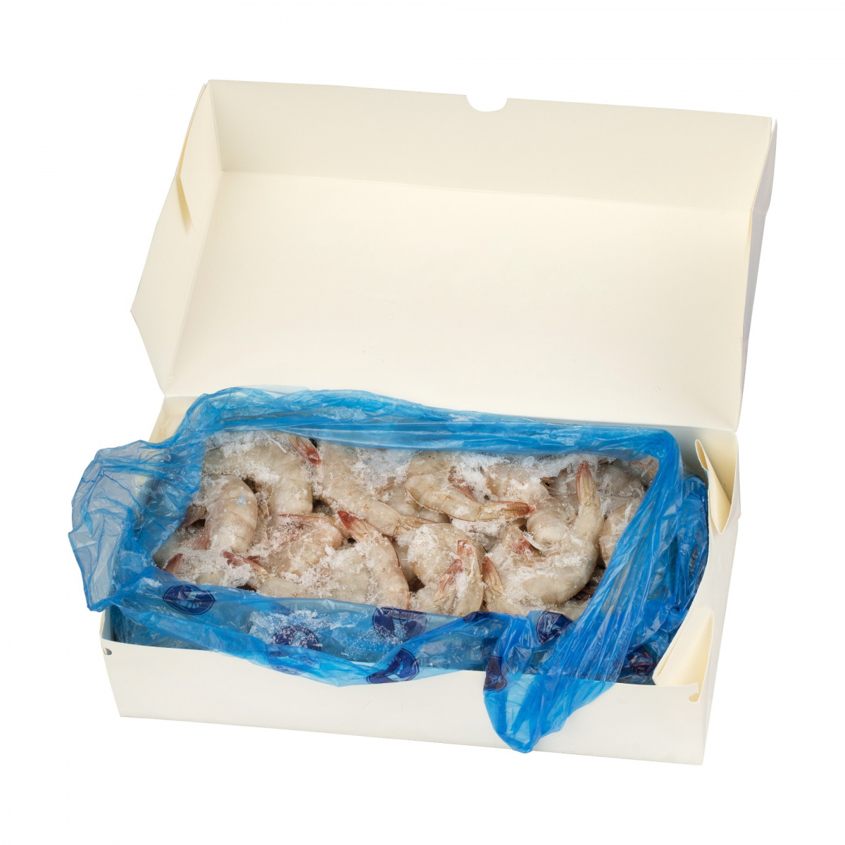 Крупные цельные креветки в замороженном блоке, без головы и с сохранённым панцирем. Отличаются мясистой структурой и ярким морским вкусом. Используются в жарке, варке, гриле и приготовлении первых блюд и паэльи.